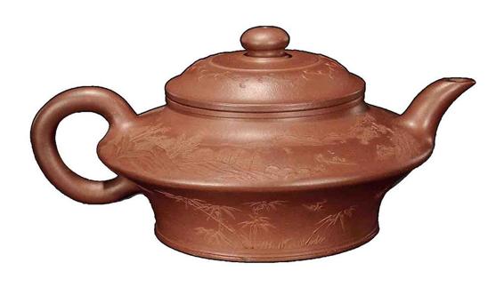 █〔清〕紫泥泥绘山水纹折肩壶