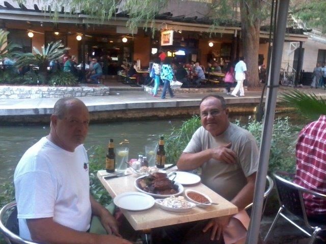 2013年9月30日,加里(右)和我在德克萨斯州圣安东尼奥滨河步道参加美国海军陆战队越南油轮协会重聚活动。加里和我曾一起在越南服役。