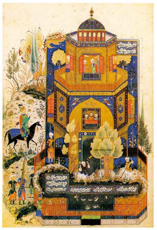 [3]在内扎米的《霍斯陆与席琳》中,席琳与霍斯陆相爱之后,霍斯陆在未正式娶席琳之前,便想占有席琳的身体,席琳不从,霍斯陆一气之下扬长而去,其间霍斯陆移情别恋。后来,霍斯陆悔悟,想起席琳的柔情,便策马赶往席琳所住的宫殿,但席琳拒不让他进宫。霍斯陆便在席琳所住的宫殿外流连徘徊,终于等到席琳打开窗户与他相见。这个场景被历代细密画家们反复描绘,成为一个经典场景。