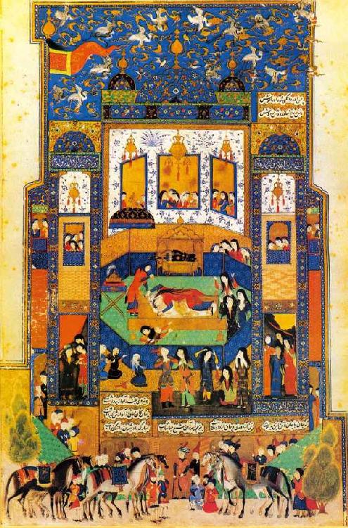 [4]这两处都涉及到细密画的俯视视角和全知的特征。从真主的全知俯视视角来说,在真主的眼中远处近处的人、物一样大小,山峰、房屋等都挡不住真主全知的眼睛,因此在细密画中山前山后的人、物处在同一平面,房屋建筑犹如初刀从中剖开,里面的人物活动一清二楚。从人的角度来说,苏非神秘主义认为肉眼所见是幻,只有心灵之眼觉悟的东西才是真实。因此,对于细密画家来说,其视角焦点是流动的,画家画某处,焦点就落在某处,没有远近大小之分,因为现实中远处的景物、人物与近处的景物、人物本来就是一样大小,只是因为肉眼的缘故错使它们“看起来”不一样大;外屋的人在做这件事的同时,里屋的人在做那件事,不应该因为肉眼看不到就不去表现;同样,山体屏蔽的只是人的肉眼,却屏蔽不了人的心灵之眼,因此在细密画中山后的人物与山前的人物活动一样一清二楚。
