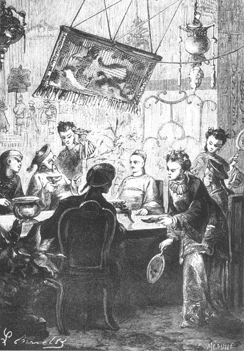 屋子中间的长方形桌子漆黑发亮,每件银制品和瓷器都像水晶饰品一样清澈透明。桌面上没有铺桌布,一片片小方纸在桌面上折叠出各式各样的图案,十分美观,它们是垫碟子用的。桌子四周摆设着大理石靠背的椅子。在炎热的天气里,人们都喜欢坐这种凉爽的椅子,而不喜欢坐垫子沙发。