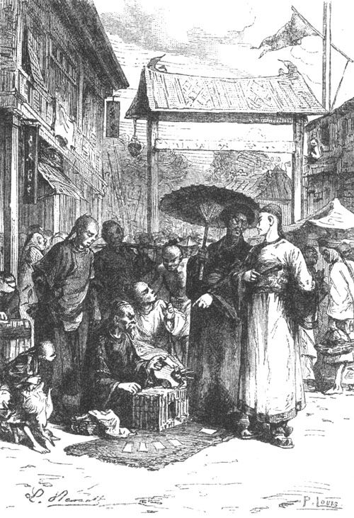 离开码头,绕过一道道城墙,来到了法国租界。突然,他们看见一位身着蓝色长袍的男子,手拿一根木棒,敲打着一支空水牛角,招引周围的观众。