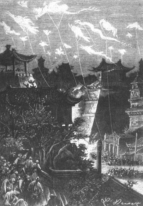 金福走上前去,主婚人递给他一把钥匙,金福打开轿门,伸出手牵着娜娥,她打扮得非常美,兴奋得有点颤抖。她慢条斯理地下了轿,穿过聚集的客人。两旁的客人将手举至胸前合十,恭贺新郎新娘。新娘进入公馆时,信号员发出信号,顿时放出各种彩色风筝,有龙有凤,还有其他象征着婚姻的风筝,一起飞向天空。一群鸽子也放飞了,每个鸽子的尾巴上绑一个小小的乐器,飞入天空后便发出清脆悦耳的声音。同时不计其数的焰火射向天空,发出各种呼啸声,然后一阵金色的雨落下,五彩缤纷。