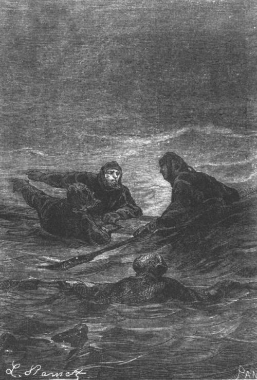 这真是一次奇怪的转变,幸运现在降临到金福和他的同伴身上了。他们游啊游啊,几乎是平躺在水面上划着桨,需要休息的时候就直立在水中。离开船一个小时后,他们发现离船大约半英里了。他们便停了下来,靠着桨休息,轻声细语地开始商量起来。
