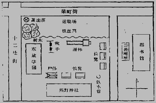 图书馆、熊野神社和运动场聚在西北角上。事件就发生于这个死角。荣町街与十二社街交叉的地方有个派出所,和现场相距不远。从这个意义上来说,现场也是派出所后面的死角。