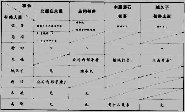 第四个事件是木屋之死。如果木屋自己讲的是真实的话,那么凶手当时的目标就是城久子,而误击了木屋,致使木屋死亡。