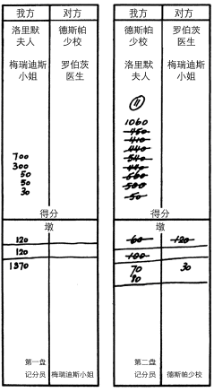“第三轮由洛里默太太记分——她和罗伯茨医生搭档对抗另外两人——争夺非常激烈,双方的分数轮番上涨。医生叫牌叫得太高,最终未能得手——但他们两位都是一流高手,所以一直没落后太多。如果医生过高的叫牌引得对方也轻率叫牌,他们就有机会通过‘加倍’锁定胜局。看,这些数字是没打成的加倍牌。字迹也很有特点,优雅、清晰、有力。