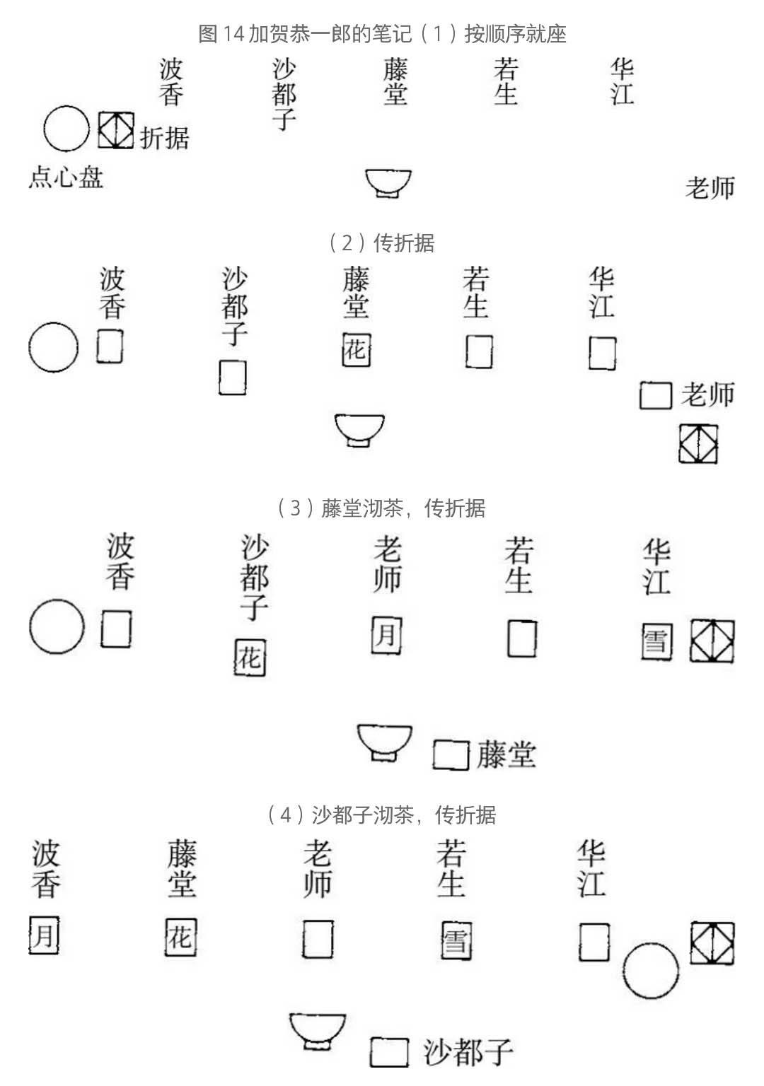 4. 沙都子沏茶。座位顺序变成:波香、藤堂、老师、若生、华江。再传折据,波香是“月”,藤堂是“花”,若生是“雪”。