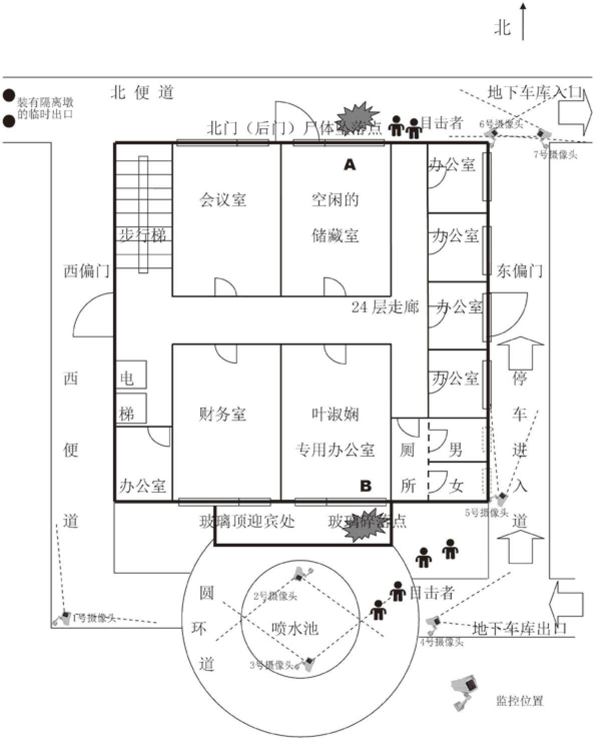 图上的B点就是位于南面的叶淑娴办公室窗玻璃的破碎位置,与实际的地面碎玻璃落点处于同一条垂直线上。而图上的A点,则是由现场勘验的警察推算出来的,相对于地面尸体实际坠落点的虚拟垂直位置,意即假如尸体是按照正常的自由落体运动而落地的话,应该是从A点开始的才对。