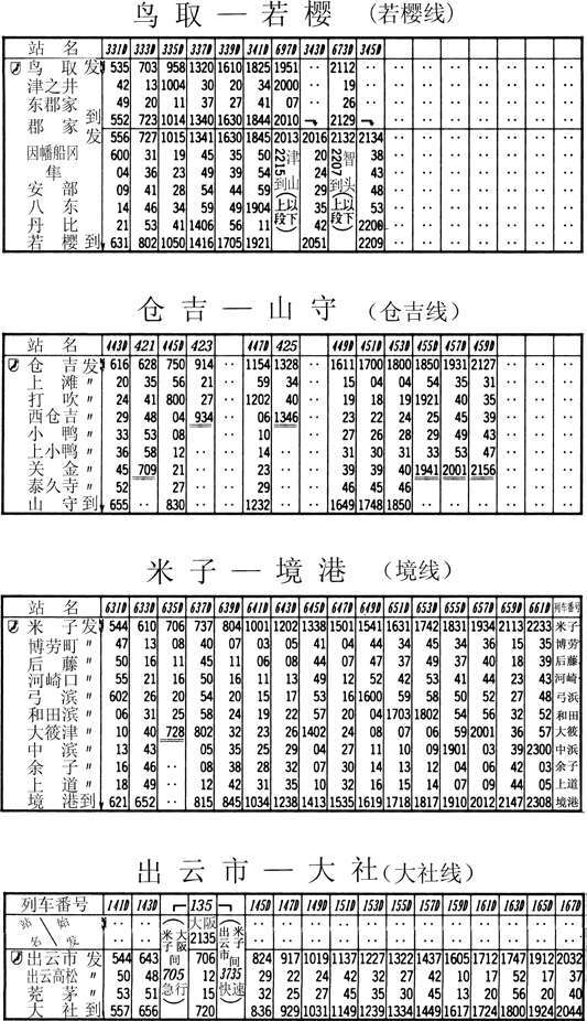 若樱线、仓吉线、境线都是支线,从时刻表上就可以看出来,支线的全程距离并不长。以大社线为例,从始发站到终点站只有十二分钟的路程。