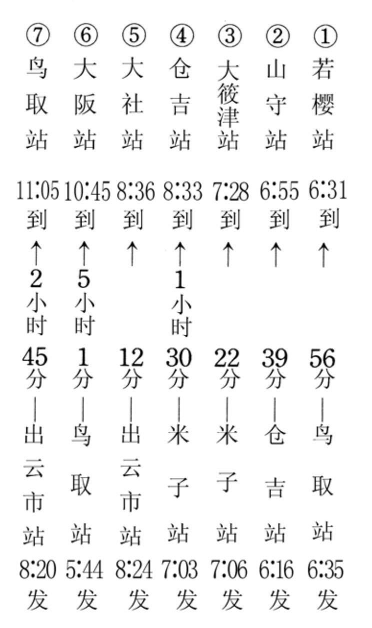 吉敷列出这张新表后,又发现了另一件让他惊讶的事。列车始发的时间竟然按照时间的前后排列着。五点三十五分从鸟取车站开始,八点二十四分在出云市车站结束,其间大约是三个小时,准确地说是两小时四十九分钟。如果以漂流物到站的时间来考量的话,从第一件到最后一件的时间是四小时三十四分钟。用起点的时间来考量的话,时间缩短了很多。