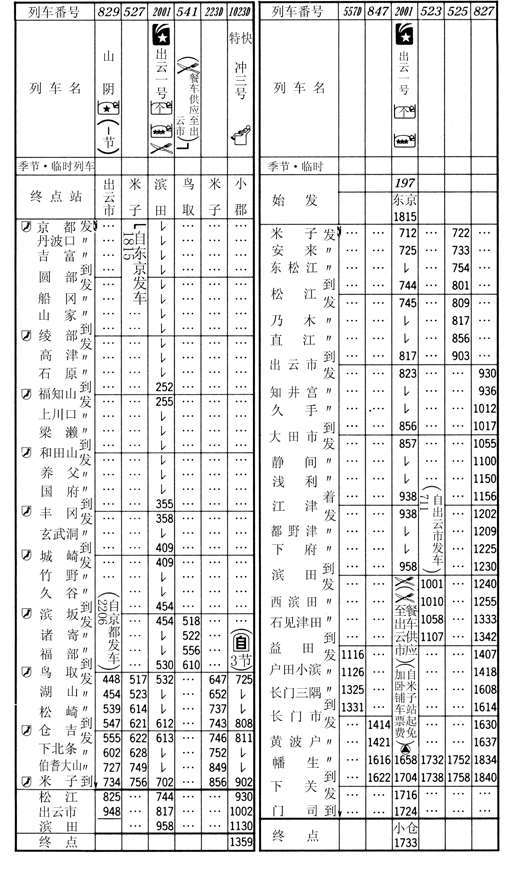 吉敷再度把视线放在时刻表上。“出云一号”的始发站是东京,发车的时间是十八点十五分——也就是晚上的六点十五分,开往山阴地区;它的终点站并不是出云市,只是经过那里,终点站是滨田,抵达终点站的时间是翌日早上九点五十八分。