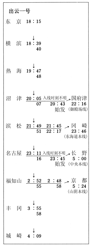 首先是沼津。“出云一号”到达沼津的时间是二十点五分,并于两分钟后开走。