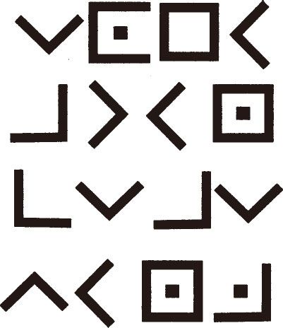 兰登从巴拉米手里接过活动铅笔,用下巴把笔芯顶出来,开始研究那些密码文字。密码实在太简单了,他几乎不需要笔和纸。不过,他想要保证准确无误,于是他拿起铅笔在纸上写下共济会密码中最普通的解码密钥。这个解码密钥由四个字母格组成——两个不带点字母格和两个带点字母格——按顺序一一填入字母。字母表里每一个字母现在都按顺序被塞进一个独具形状的栏位。这样,每一个字母所占栏位的形状就成为与字母对应的符号。
