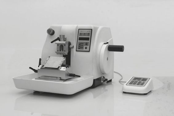 切片使用的仪器是切片机。切片机对一个法医很重要,别看只是个小小的机器,它能把蜡块中的组织切成很薄很薄的片。这些薄片薄到只有一层细胞,为了不出现在镜下多层细胞重叠并有碍观察的情况,必须要达到一定的标准。切下来的薄片,放在摊片机里,就会因为水的张力作用而张开,周边的蜡融化,只剩下一层薄薄的组织。切片和摊片是技术含量最高的两步工序,如果法医的技术好,则可以一次成功,如果技术不好,则要反复切、摊。当然,取下来的检材有限,所以也由不得法医不停地去切,所以技术好可以节省检材,以备今后复核检验。