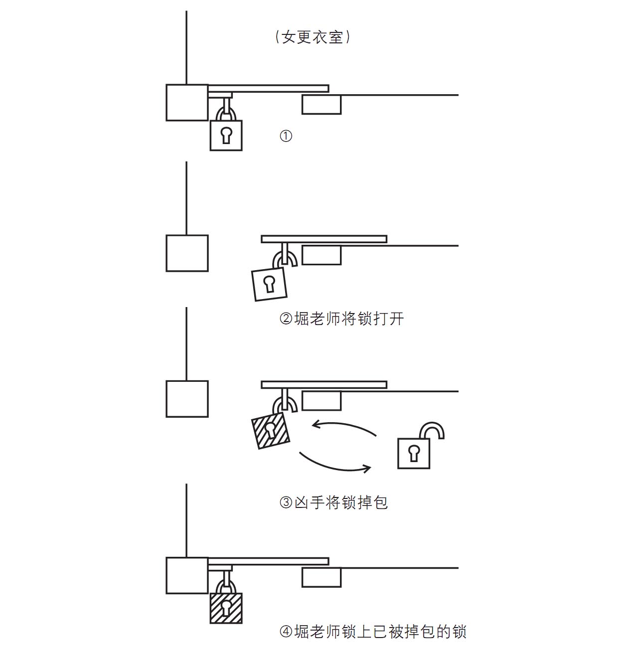 雅美把钥匙递给堀老师:“假设我是凶手,为了不被您发现,躲在更衣室角落里。” 她说着躲在更衣室拐角,只露出头来:“老师,对不起,请您像那天一样把锁打开,走进更衣室。”