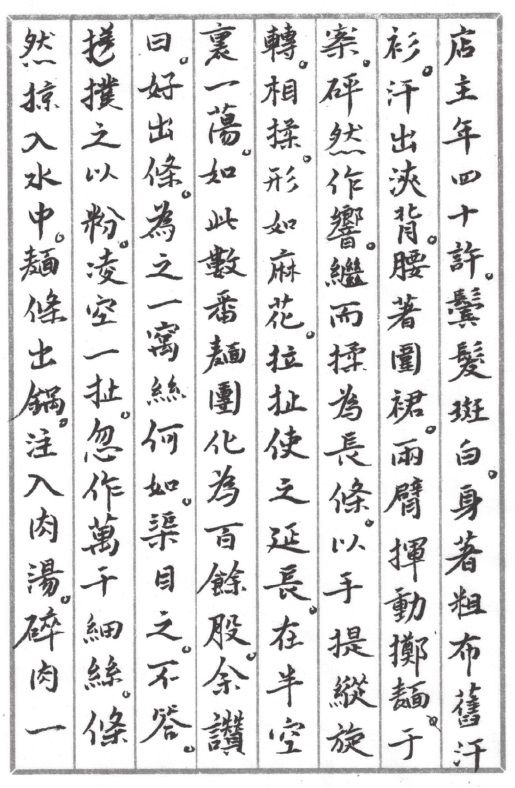 老板盛了一碗搁在案板上,捡起三毛钱,又拣出一毛还给我,然后在地上的盆子里洗了洗手,继续做面,也不说话。