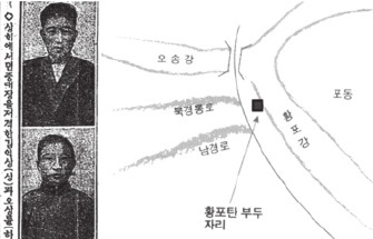 1922年3月28日下午3点多,义烈团成员在上海外滩码头暗杀日本大将田中义一。图为当时韩文媒体绘制的现场复原图,两个男子是被捕的义烈团成员金益湘和吴成伦