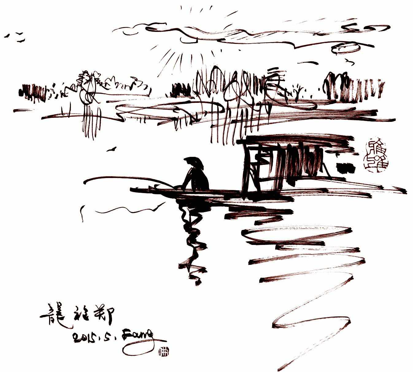 看着看着,一个景色把皇上吸引住。不远河上停着一只船,有舱有篷,一个渔翁坐在船头钓鱼。人在船上,影在水里,像个画儿。
