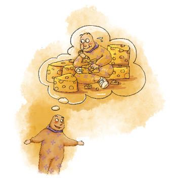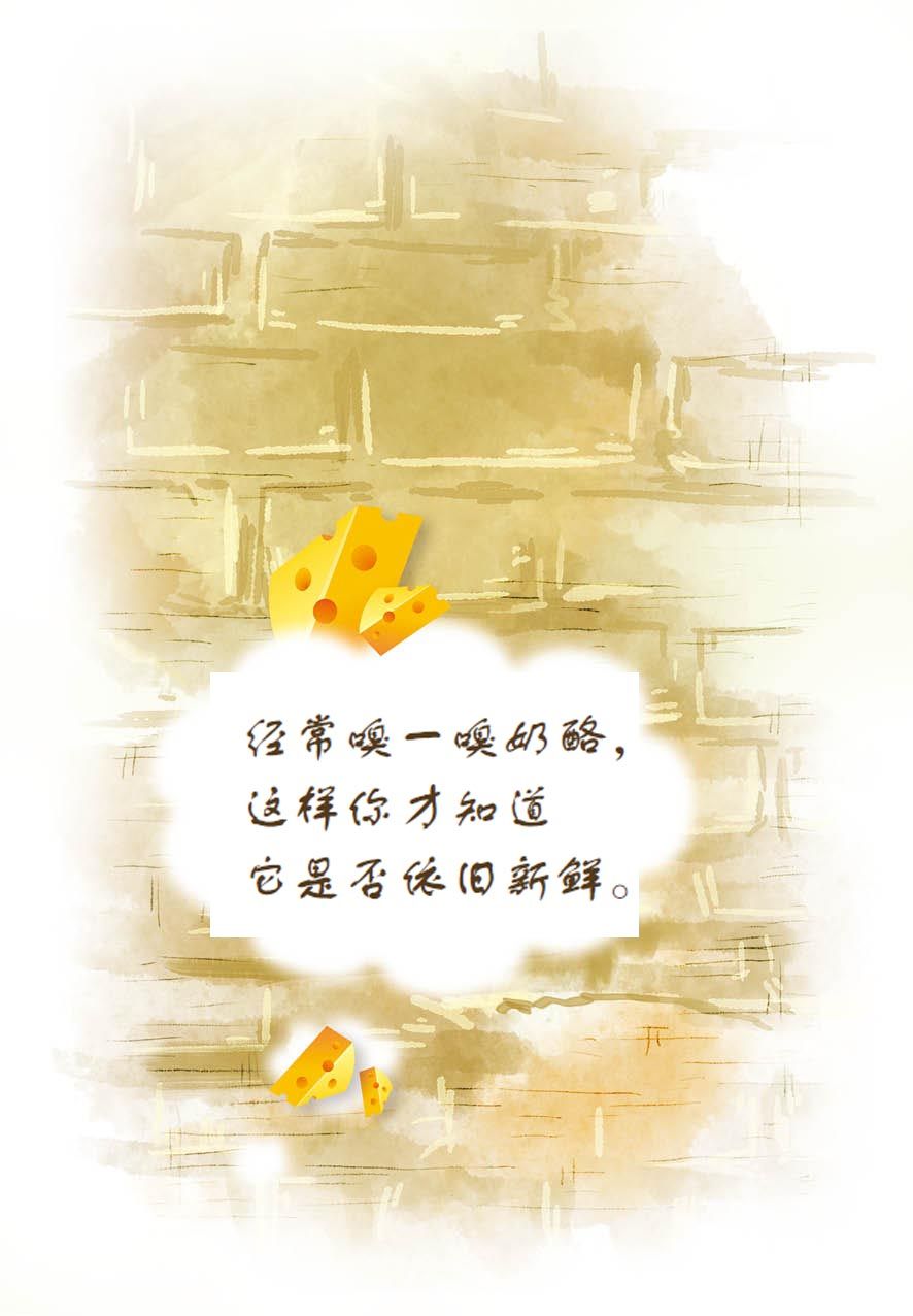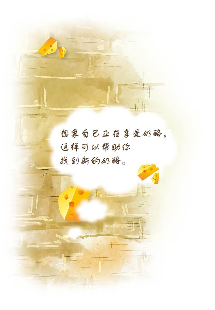 为了给自己鼓劲儿,唧唧又在脑海中描绘了一幅画面,里面的细节是如此真切:他看到自己坐在一堆奶酪中间,周围全都是自己喜欢的品种,有切达干酪、法国布里干酪……他看到自己在品尝各种各样美味的奶酪,还想象着自己正在享受它们美妙的滋味。