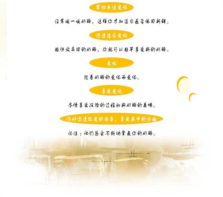 唧唧知道,自己现在和在奶酪C站时已经有了很大的不同,但是如果自己重新陷入安逸的生活,那就很容易回到过去的状态。因此,每天他都会检查奶酪N站里奶酪的情况,而且他还会尽力作好准备,免得被突如其来的变化弄得不知所措。