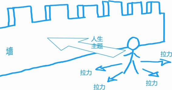 如果你身上有多个拉力,将你向各处拖动,不让你向自己的方向前进,这代表着什么?看到这幅图的人一般会认为,这代表着其他人的看法、社会的看法、家庭的看法……想象一下,假如一个男人,背着房贷,干着一份收入不错的工作,33岁,想去分享,去写东西,去支持别人。你什么看法,他家人什么看法,他老爸老妈什么看法……很多人一想到这里,内心就拽出各种力量,一个力量说:“那是你的人生主题啊,去干吧。”一个力量说:“别整那些不靠谱的,赚钱才是王道。”另一个力量说:“早跟你说去个国企,稳定了,这辈子就踏实了。”还有其他的力量。古人讲“十目所视十手所指”,就是这个意思。