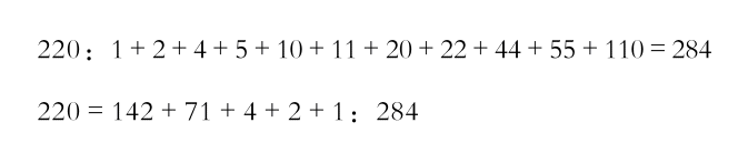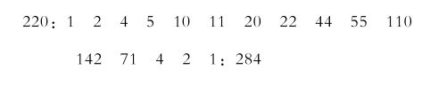 “正确。看来你还是懂的嘛。那么,让我们把220和284的因数,除这两个数字本身以外,都写下来看看,就像这样——”