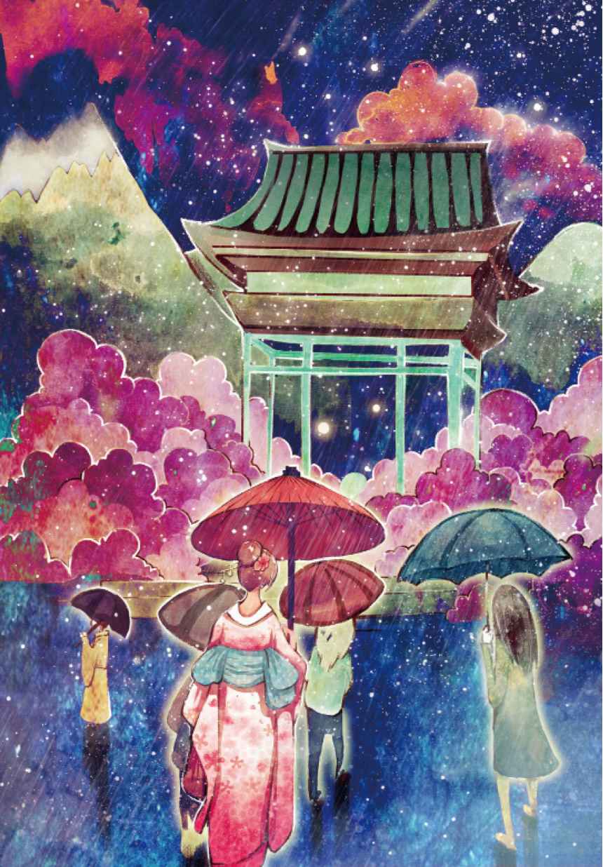 穿上了母亲那件樱花图案的和服,