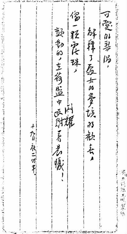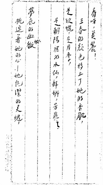 编者按:该诗已收入《志摩的诗》(【全二】八九)。惟字句略有出入:第六行“涧泉幽抑了弦琴的声喧”排印稿作“涧泉幽抑了喧响的琴弦”。第八行“欢情的绻缱”排印稿作“翻飞的欢恋”。第二十六行“她纯洁的灵魂”排印稿无“她”字。第三十一行、三十二行“