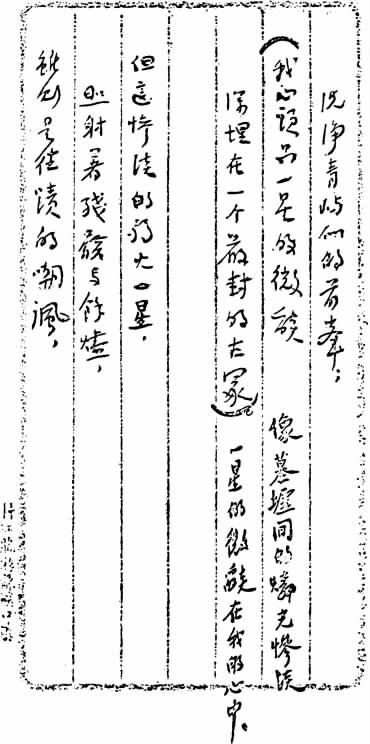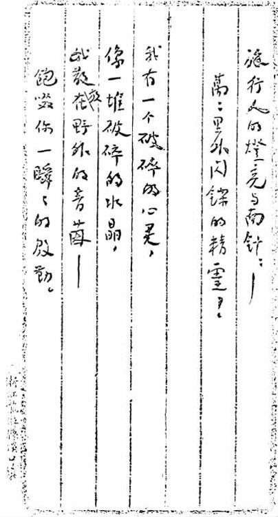 编者按:该诗已收入《志摩的诗》(【全二】四七)。惟题目“一星的弱火”排印稿作“一星弱火”,字句亦有出入:第八行“凝聚”排印稿作“凝敛”。第十行“洗净青屿”排印稿作“洗净了青屿”。第十二行“中心”排印稿作“胸中”。
