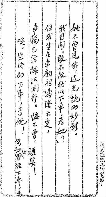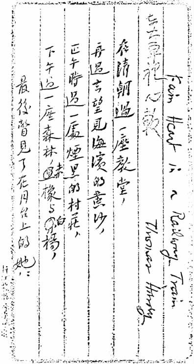 编者按:该已收入《志摩的诗》(【全二】六二)。惟字句稍有出入:第三行“光明”排印稿作“晶莹”。第四行“我爱他们的恒心”排印稿作“人间没有这异样的神明”。第六行“侵晨”排印稿作“清晨”。第九行“涧边”排印稿作“山涧边”。第十行“楼上”排印稿作“高楼上”。第十三行“心灵”排印稿作“魂灵”。第十五行“散放在野外的青茵”排印稿作“散布在荒野的枯草里”。第十七行“冷激”排印稿作“冰激”。第二十行“伤心”排印稿作“心伤”。