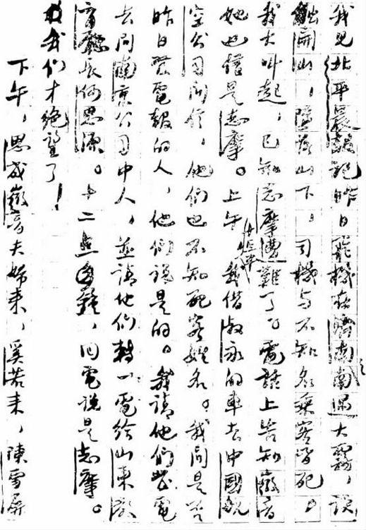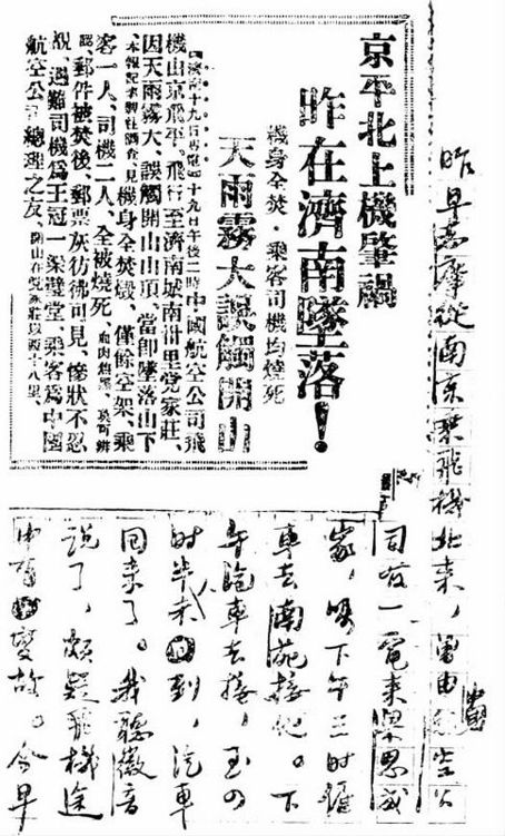 昨早志摩从南京乘飞机北来,曾由中国航空公司发一电来梁思成家,嘱下午三时雇车去南苑接他。下午汽车去接,至四时半人未到,汽车回来了。我听徽音说了,颇疑飞机途中有变故。今早我见《北平晨报》记昨日飞机在济南之南遇大雾,误触开山,坠落山下,司机与不知名乘客皆死,我大叫起,已知志摩遭难了。电话上告知徽音,她也信是志摩。上午十时半,我借叔永的车去中国航空公司问信,他们也不知死客姓名。我问是否昨日发电报的人,他们说是的。我请他们发电去问南京公司中人,并请他们转一电给山东教育厅长何思源。十二点多钟,回电说是志摩。我们才绝望了!