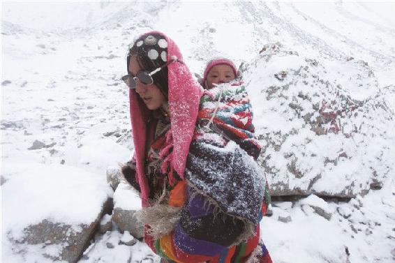 背着小孩转山的藏族妇女。