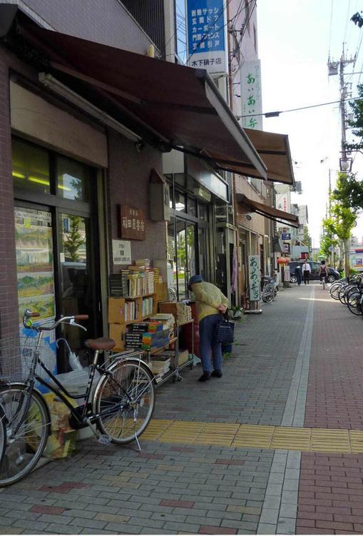 百万遍沿东大路向北,到御荫通,路口东北角有一家旧书店,叫福田屋。窗玻璃上贴了好几张日本古地图,很好看。门外一张长凳,堆了些折价书籍、图录,还有一架文库本。十字路口的人等红绿灯时,偶尔会被书摊吸引过去翻一翻。