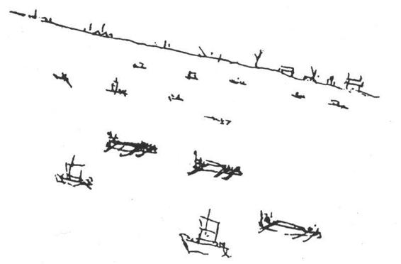 初快到常德时,船只与水面情形,小船多载日用货,集中于码头,大船多扬帆摇橹,并歌呼而前。(本书插图为作者原作)