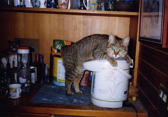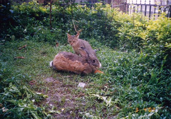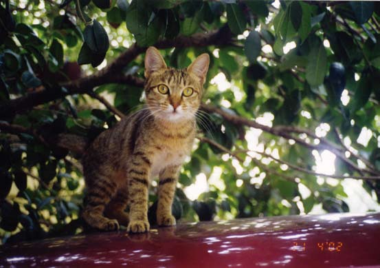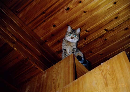 便很快地那日来临,我们非常清楚地听到小鸡的啁啾哭啼声,就在耳下,就在屋里!一干人拔腿寻声前往,二楼的后阳台,纳纳与一只小鸡并肩坐在那里,小鸡并未受伤惊吓,纳纳也只朝我们眯觑两眼(那与打呵欠这个肢体语言同样,都是心情high到极致之后的必要淡然放松反应),个头比小鸡大不多少的纳纳,要不松不紧衔着叫不停又扇翅挣扎的小鸡跑过绿地、跃过山沟、跳上屋院短墙、闪过闻声前来关切或抢夺的其他猫族、沿壁走、纵上二楼……略想象那过程那情景,佩服喝彩都来不及,哪好责骂她,只默默地赶紧将小鸡捧还给潘老板。