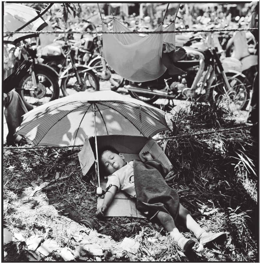 老友高信疆找我筹办一本新杂志,杂志虽没出成,但前后一年的全省采风,使我碰上了好多难得的画面。这张在盛夏正午时分所拍的照片,正是为那胎死腹中的杂志所做的一篇报道。在台南县西港作醮随王爷神舆绕境的进香队伍中,这个含着奶嘴、于树荫伞下香甜入睡的幼儿,应该是年龄最小的成员了。