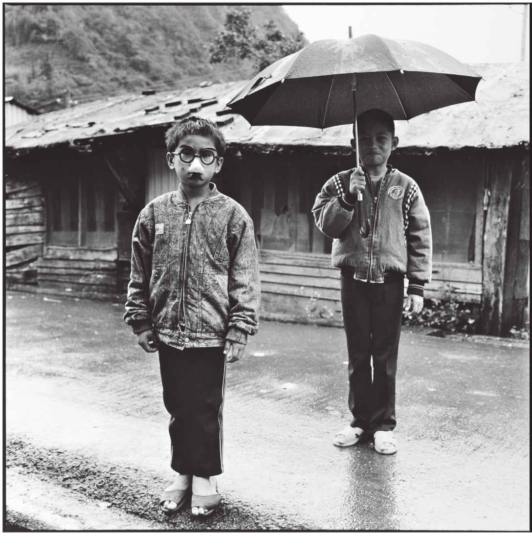 那天来到南澳正逢下雨,相机最怕淋雨,我跟学生没备雨具,大部分时间只好躲在屋檐下聊天。原以为会无功而返,却见雨中有两个小男孩朝我们走过来。其中一个戴着大鼻子眼镜装老头,鼻下还有一撮翘胡须,好像这样就能提早长大。