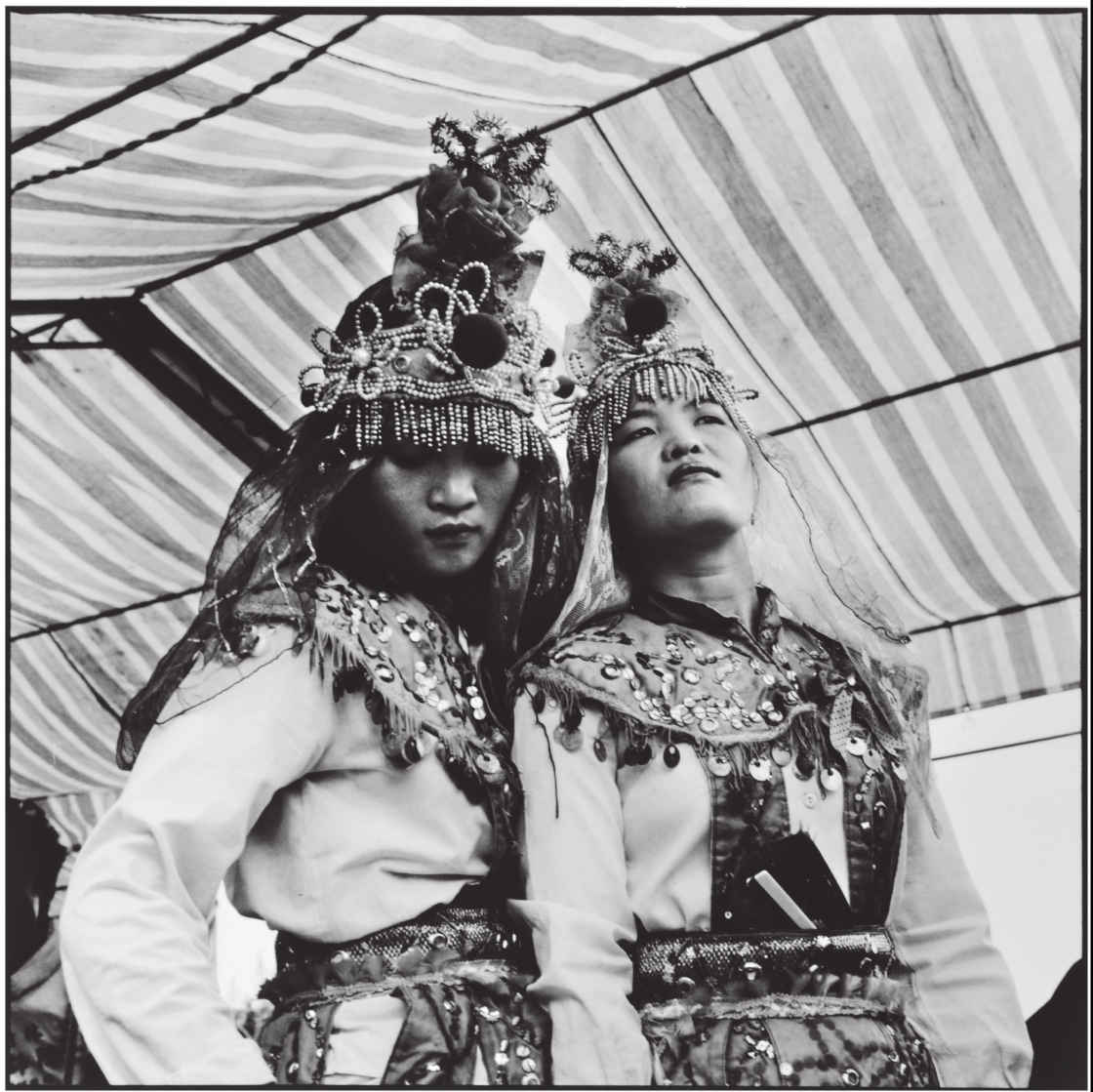 我拍过的阵头不多,主要原因是,会拍照后,阵头已跟我小时候看到的很不一样了,细腻成分消失,只剩喧嚣。倒是这两位阵头团员吸引了我的注意,已着好妆的她们,在车鼓阵还没出发前,于棚下稍事歇息。看脸孔就知道,她们是普通乡下人,但阵头锣鼓一响,就会立即化身为家喻户晓的历史人物。