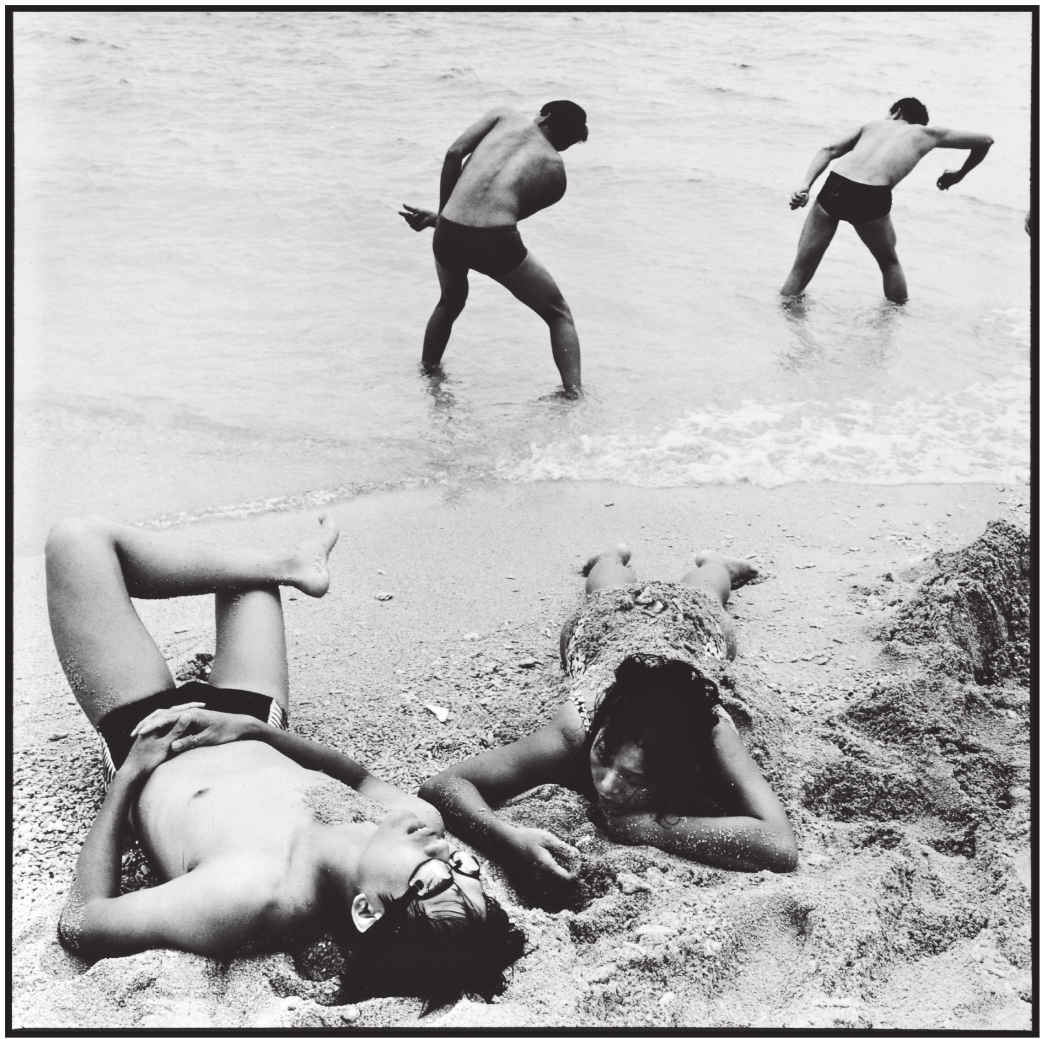 沙滩上的小情侣聊着毕业后找工作的事,两个男生则是玩兴不减,等着浪潮涌上来打水漂。这样的场景,若是用135长方形构图,很容易就会使人拍成一前、一后的两张照片。而用120相机的正方形构图,就会把原来看似不相干的独立事件框在一起,形成两者之间的微妙牵连。一个是责任与牵绊的现实世界,一个是自由与理想的心灵梦土。
