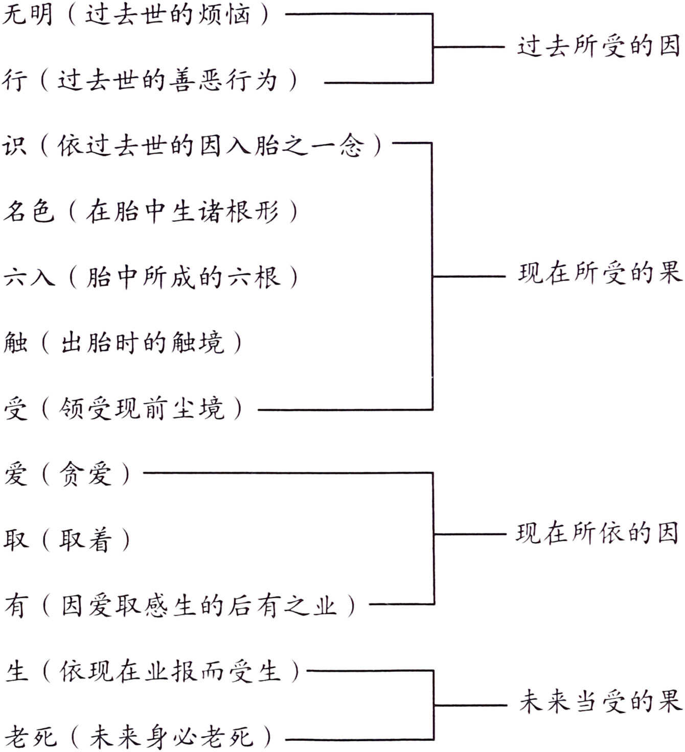 佛教讲缘起、讲十二因缘,十二因缘就是无明、行、识、名色、六入、触、受、爱、取、有、生、老死。人生三世(包括过去世、现在世、未来世)就是十二因缘的循环。