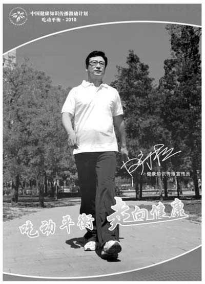 近几年,我一直是卫生部“健康激励计划”的健康知识传播宣传员,这是我为2010年主题“吃动平衡,走向健康”拍的宣传海报。现在的中国人,很多在年轻时用命换钱,希望岁数大了能用钱买命,可惜,往往晚了。其实,健康才是真正属于自己的最大财富,储蓄健康比一味储蓄金钱更实惠。您应当每天提醒自己:迈开腿,管住嘴,让自己走向健康。