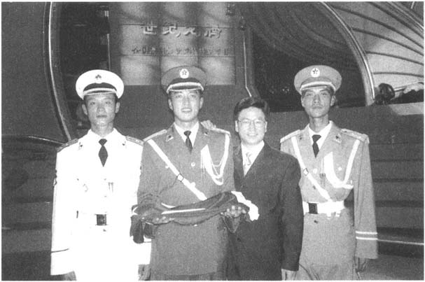 站在国旗护卫队旗手的身边,我近1米80的个子也成了小个子,中间那位英气逼人的小伙子叫朱涛,1997年香港政权交接仪式和1999年澳门政权交接仪式上鲜艳的五星红旗都是由他亲手升起,我问他:怎么能一秒不差?朱涛答:0.01秒都不能差。