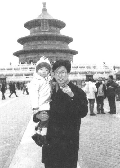 新千年的第一天,去和“天”与“地”联络一下感情,外表有些轻松,内心却很度诚,只是怀中的儿子未必知道:干吗不在家里待着?