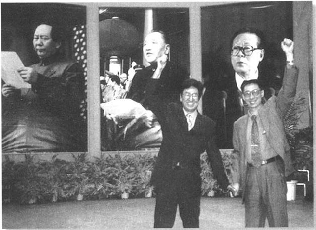 国庆三十五周年大庆的时候,游行的大学生方阵经过天安门城楼时,突然亮出“小平您好”四个大字,成为改革过程中的经典画面,在国庆五十周年庆典直播中,当初“小平您好”横幅的制作者之一赵宝晨,成为我们的访谈嘉宾,于是我和他又做出高举“小平您好”横幅的手势,算作对伟人的纪念。