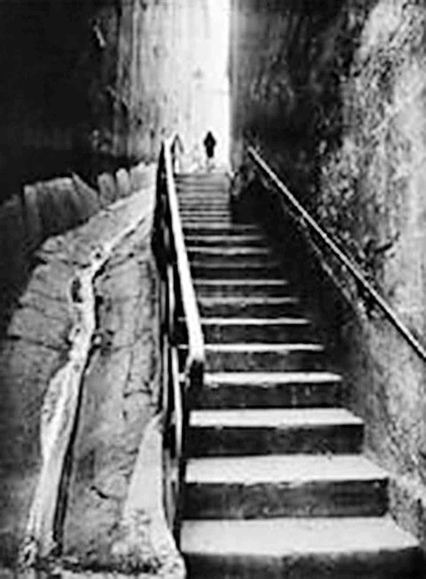 德卡拉瓦喜欢拍摄人们上下阶梯。在他的照片中,阶梯构成生活的基本事实。你走上或爬下楼梯就好像攀登一座山峰一样——因为它们就在那里。不同之处在于你也许可以选择不爬山,而台阶却无从避免。没有电梯或自动扶梯,你会总是遇到它们。有时候,似乎除了楼梯别无其他路径。摄于1987年的照片表现两个走在地铁台阶上的男子,他们充斥着整个画面。看不见开始和结束。台阶令人眩晕,如峭壁般使人生畏,且提供同样绝对的自我定义。这两个男子像攀登者一样紧握扶手,似乎在用绳子将自己贴在日常生活的岩面上。德卡拉瓦镜头下的人们没有在浪费精力思考日常上坡路的隐喻内涵。酗酒者的颂歌“一次一天”整个变成行人的“一次一台阶”。那便是你如何到达更高的地面。