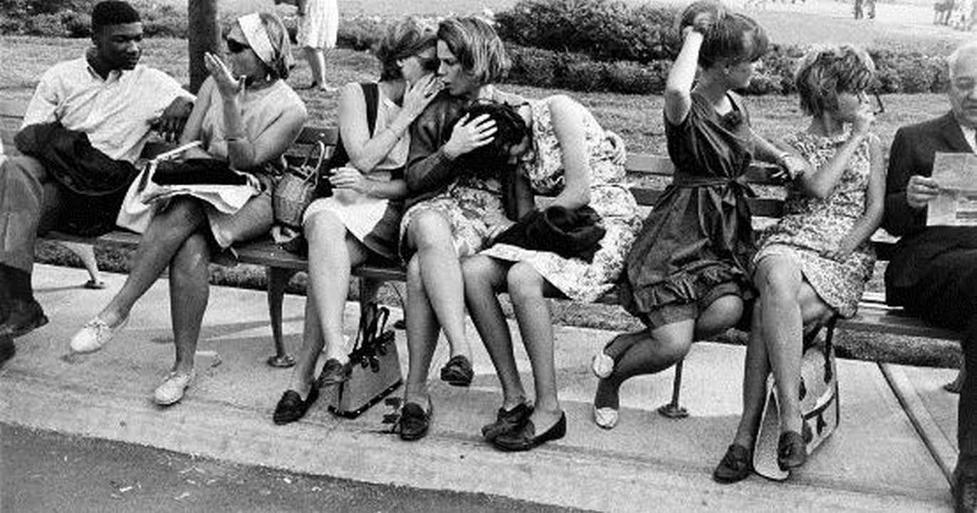 毫无疑问,对于长凳的忧郁的觉察,并非只有柯特兹一个人。对于温诺格兰德来说,长凳就像繁华大街,只不过人们是坐着而非行走着。在他摄于1964世界博览会的一张椅子上,八个人同时被连接在一起——难以辨别一组中人由谁开始由谁结束——又独立自足[35]。长凳就如同纽约之梦,不同个体因简单地被塞进小空间的简单事实而联合起来。在中国式耳语的姿态中,每个动作都被效仿,详述,重复,来回传递。长凳照片,也是腿、短裙、鞋、包、手的汇集。三组对话在进行,但正如各民族是世界博览会的一部分,他们都是同一对话的组成部分。画面主要由女性构成,一边由一位在读报纸的中年白人男性分隔,另一边是一位年轻的黑人。