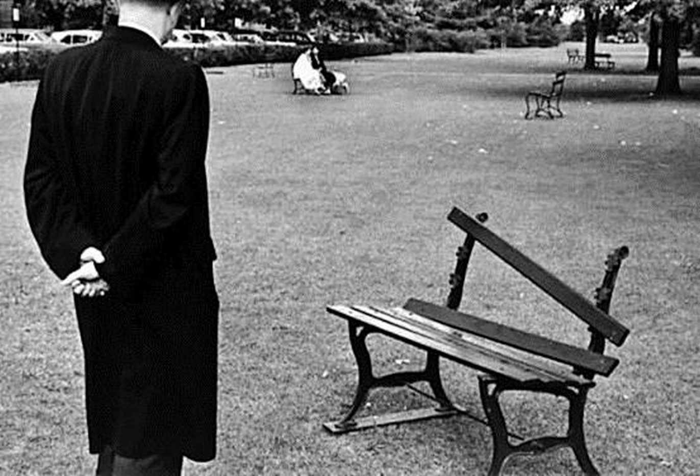 临近画面上方,有两位坐在长凳上的妇女;远处散落着各式空无一人的椅凳。画面的三分之一完全被一位身着大衣的男性背影所填充,他正俯身看着一张折断的公园长凳。很有可能,在几经生活的敲打和失望之后,你最喜爱的公园长凳对你的意义就似宠物狗和妻子般。悲哀?要点是:对有些人来说,长凳就意味着忧郁和崩溃的区别,这是多么令人伤心啊。“想成为他们,”拉金催促道,