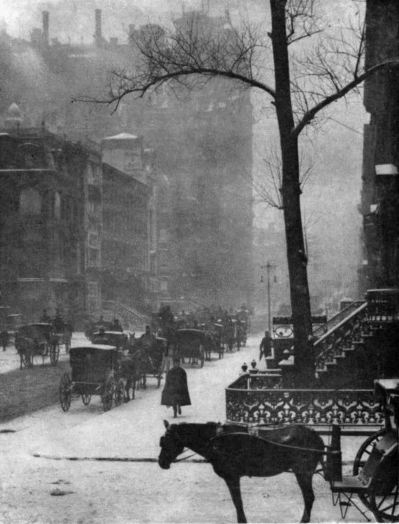 在另一张斯蒂格里茨于1900年至1901年所摄的照片中,情况要更复杂一些[43]。照片表现了第30号街在照片底端交集,而第五大道在左边斜对角向上。马拉出租车——我倾向于认为这与在1893年的第五大道上的雪中模糊看到的是同一匹马——站在画面底端,就像生长在它上方角落的一棵树一样永久。这幅照片曝光时间相对较短,抓拍了一个身披斗篷的人物正朝照相机方向走来,而在其左侧,出租马车朝相反方向缓缓移动。