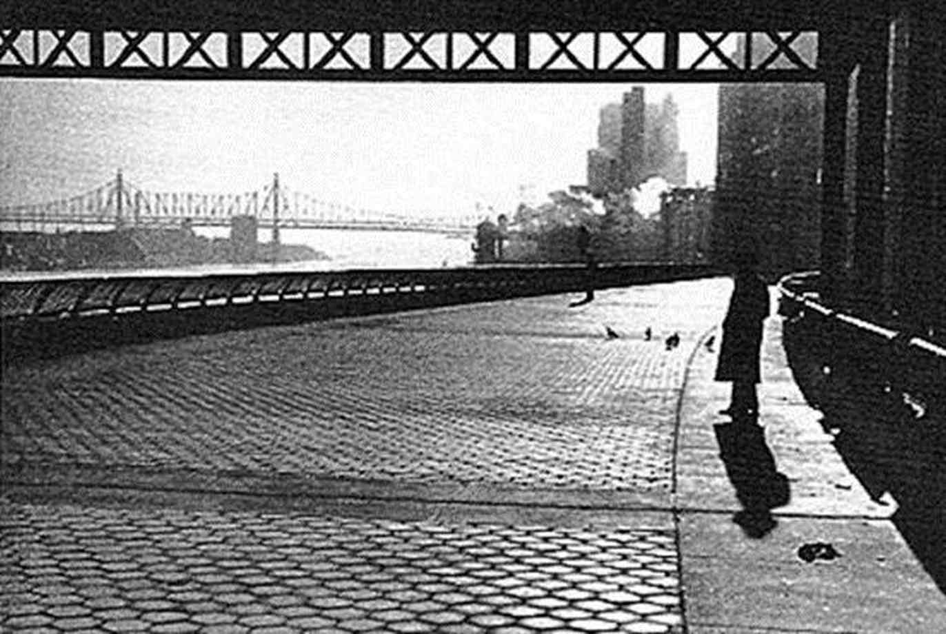 这个反复被柯特兹看见的男子,引导摄影师和我们经历了那些使一切都能以形象化的方式被理解的时刻。没有他,没有这个摄影师灵魂的外在代表,就不可能有照片产生。我们在匈牙利见过他的身影,在巴黎看到他站在奥赛码头,背在身后的手里握着拐杖,看着两个身着大衣的人向他走来。我们在1954年的纽约看到他凝视河流,桥梁成为其背景[44]。由于站在前景的他正往另一个几乎同样的人的方向看去,这使得他作为摄影师替身的感觉得到了强化。如果相机像电影一样向回拉,我们可能看到另一个人物,摄影师自己正注视着另两位主角。通过某种倒转的望远镜,这一回拉将会继续,直到我们能够追随着这目光的接力,回到摄影师正在向外望的公寓窗口。